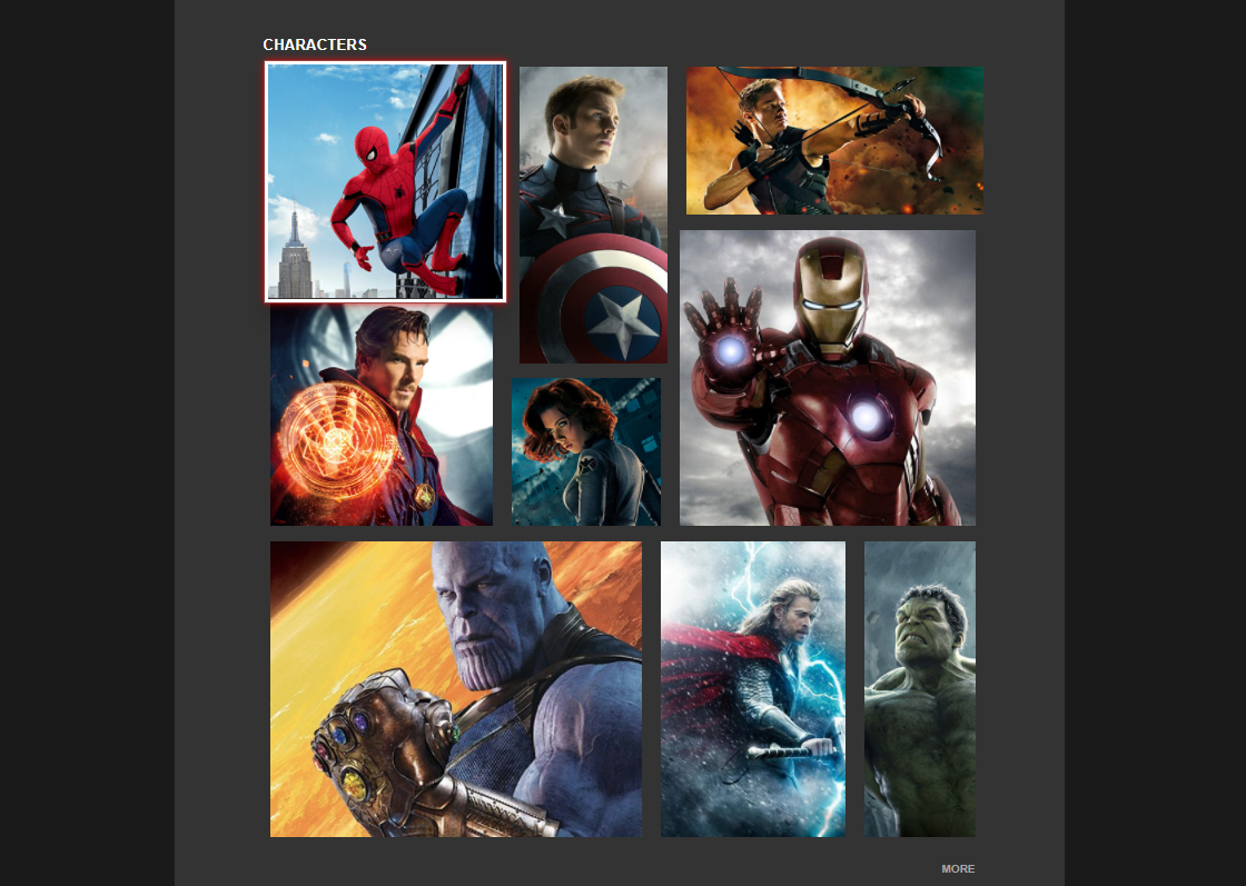 다양한 마블 캐릭터들의 이미지가 표시되며 마우스 호버시 해당 이팩트가 나오게 됩니다.
