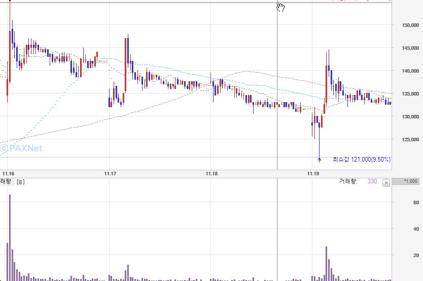 11월 19일~11월20일 차트를 보면 조정 패턴이 지속되고 있음을 알 수 있는데,