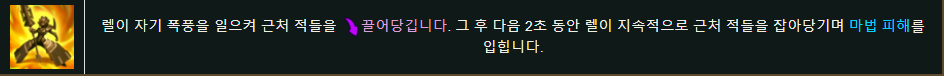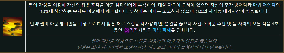 아군에게 시전하여 근처에 있는 아군의 생존력을 높히고 재시전하여 렐과 아군 사이의 있는 적에게 CC기를 걸 수 있다. CC기는 선뿐만 아니라 렐과 아군을 둘러싸고 있는 원형의 갑옷 범위에도 적용된다.