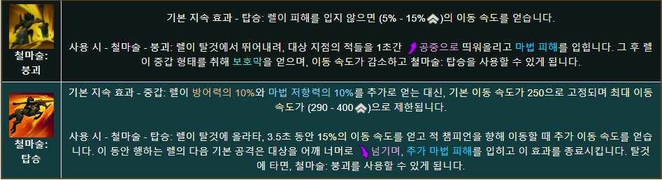 중갑 형태에서 W를 재시전 시 철마술: 탑승을 사용한다. 몸에 펼쳐져 있던 갑옷을 다시 말의 형태로 변환시켜 잠시 동안 이동 속도가 대폭 증가하며, 이동 속도 제한이 해제된다. 그리고 탑승 후 첫 기본 공격은 사거리가 100 늘어나며 추가 마법 피해를 가하고, 리메이크 이전 볼리베어의 Q처럼 적을 뒤로 넘긴다.