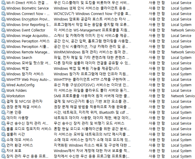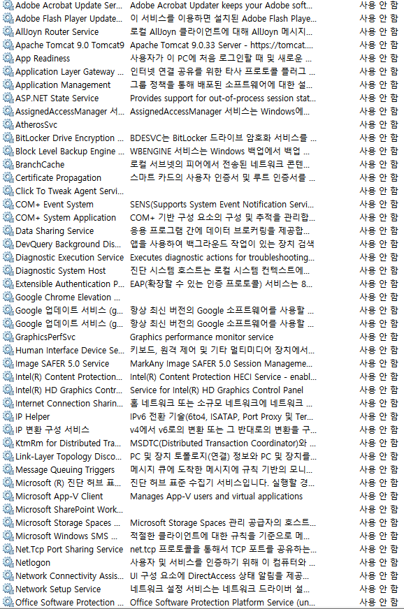 ※ 아래는 저의 컴퓨터에서 사용안함으로 설정한 서비스들 입니다.