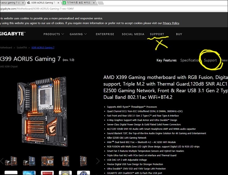 위 쪽 support는 '기가바이트 전체적인 support' 웹페이지이고, 아래쪽 support가 '내 메인보드의 support'입니다.