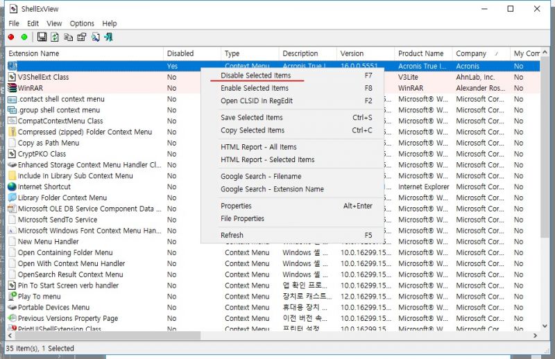 없애고 싶은 것들을 선택하여 Disable Selected Items 를 눌러주면 우클릭 메뉴에서 사라지게 됩니다.