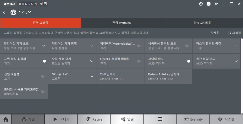 Radeon Anti-Lag : 사용(Chill과 동시에 켜지는 못함) RX5000번대이상이신 분만 사용하시며, 아니시면 Chill을사용.