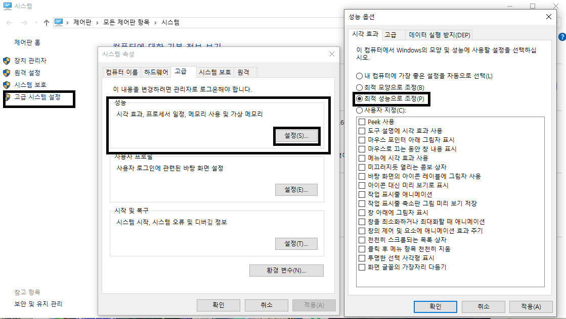-> 성능-> 설정 -> 최적 성능으로 설정