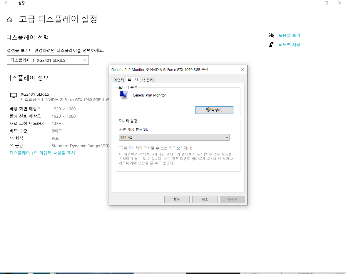 해상도 변경 -> (모니터)재생 빈도 최대로 맞추기